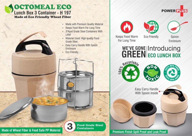Outer body made with combination of Wheat fibre and food safe plastic – Keeps Food Warm / Cold For Long Time. – 3 Food Grade Stainless steel Containers with Lifter – Easy Carry Handle With Spoon Encloser – 1 spoon included – 100% recyclable