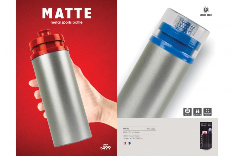Metal Sports Bottle - MATTE Material: Aluminium * Capacity: 750ml * Weight: 135gm * BPA free * Transparent turn lid * Dual opening cap for easy drinking