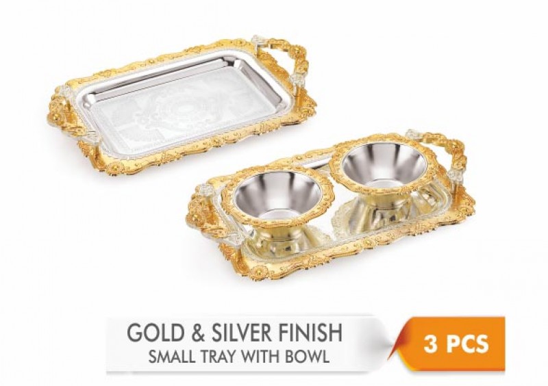 - Premium 3 Pcs Silver and Gold Bowl and Tray set