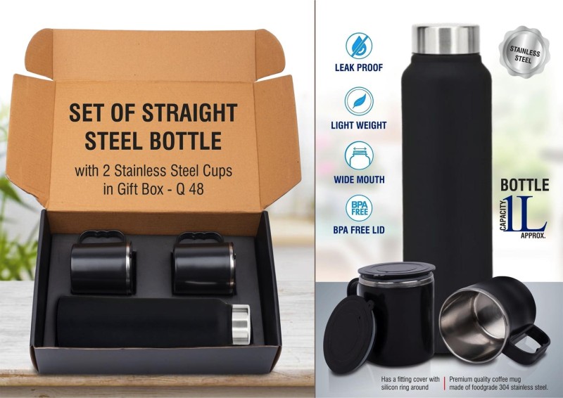 Set Of Black Stainless Steel Bottle With 2 Stainless Steel Cups In Gift Box | Bottle Capacity 1L Approx